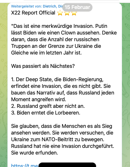 #AlexanderQuade, eine der größten #QAnon-Influencer im deutschsprachigen Raum, meinte in einem Post vor zwei Tagen, dass das russische Militär in Wien gesichtet und dort "aufräumen" würde. Die Nachricht wurde 175.000-mal aufgerufen - und obwohl es quatsch ist, nicht korrigiert.