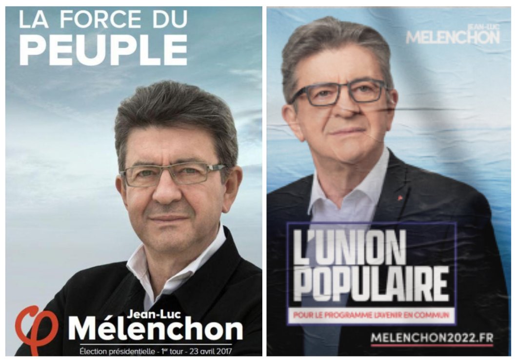 Il y a la volonté d’assumer fortement le tricolore du drapeau, d'incarner la nation. Mélenchon est devenu un candidat “mainstream”, qui privilégie les couleurs nationales à celle historiques de son camp politique. C’est plus net quand on compare les affiches de ses 3 campagnes.