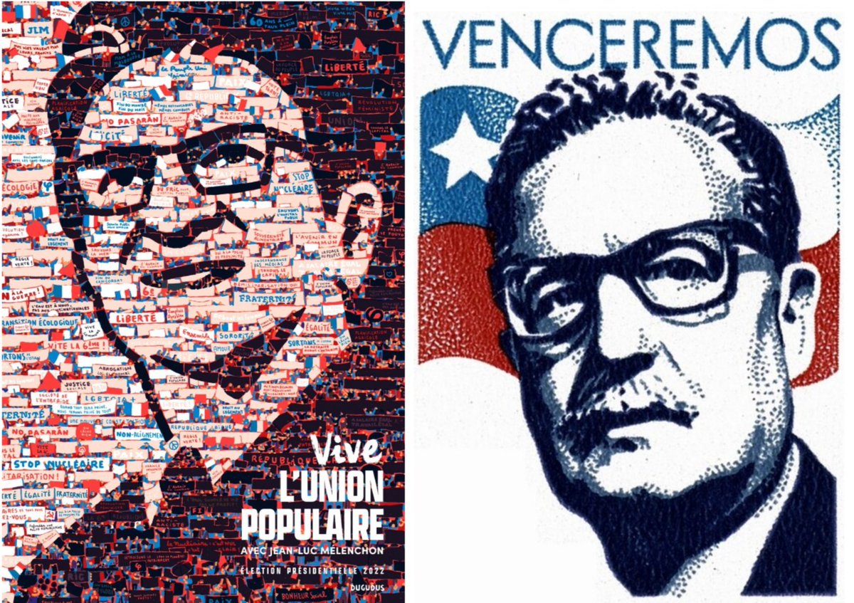 Les affiches sont même déclinées dans des versions plus artistiques, avec des clins d’oeil historiques. Comment ne pas penser à une évocation d'Allende, avec ces lunettes plus épaisses et cette posture de tête ?
