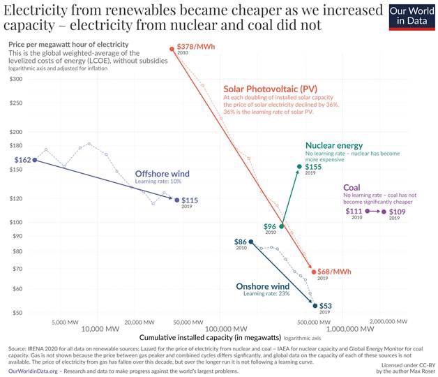 Les courbes d’apprentissage sont TRÈS favorables aux énergies renouvelables électriques.