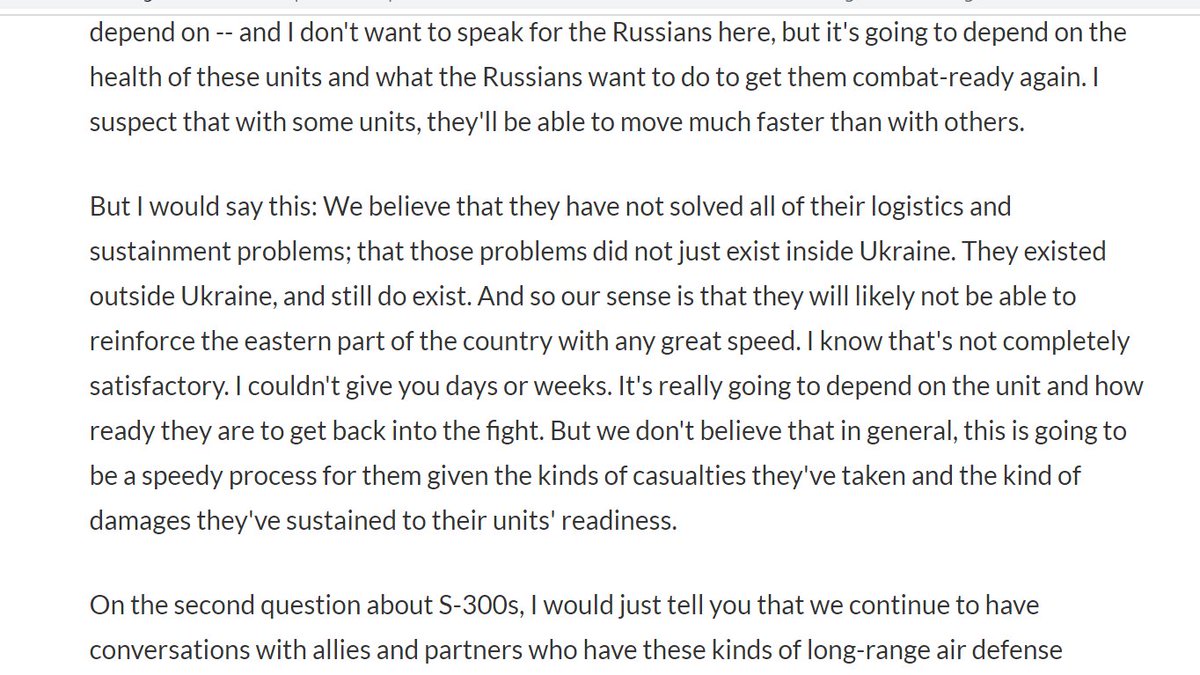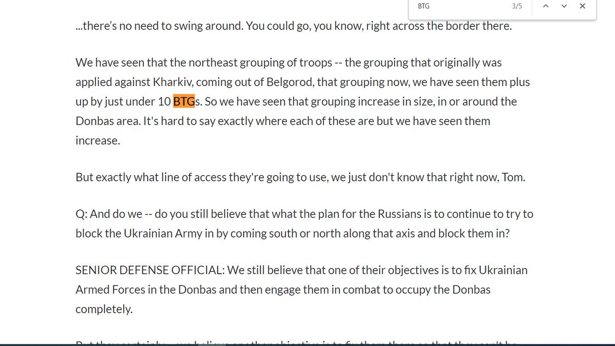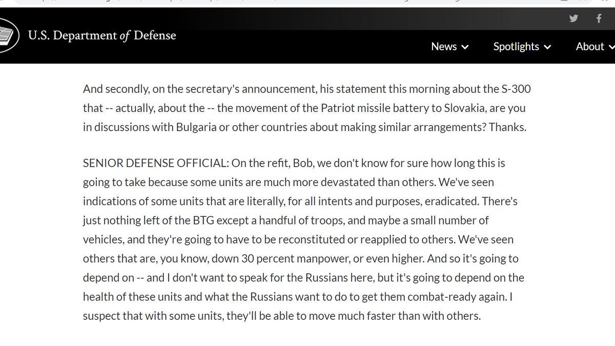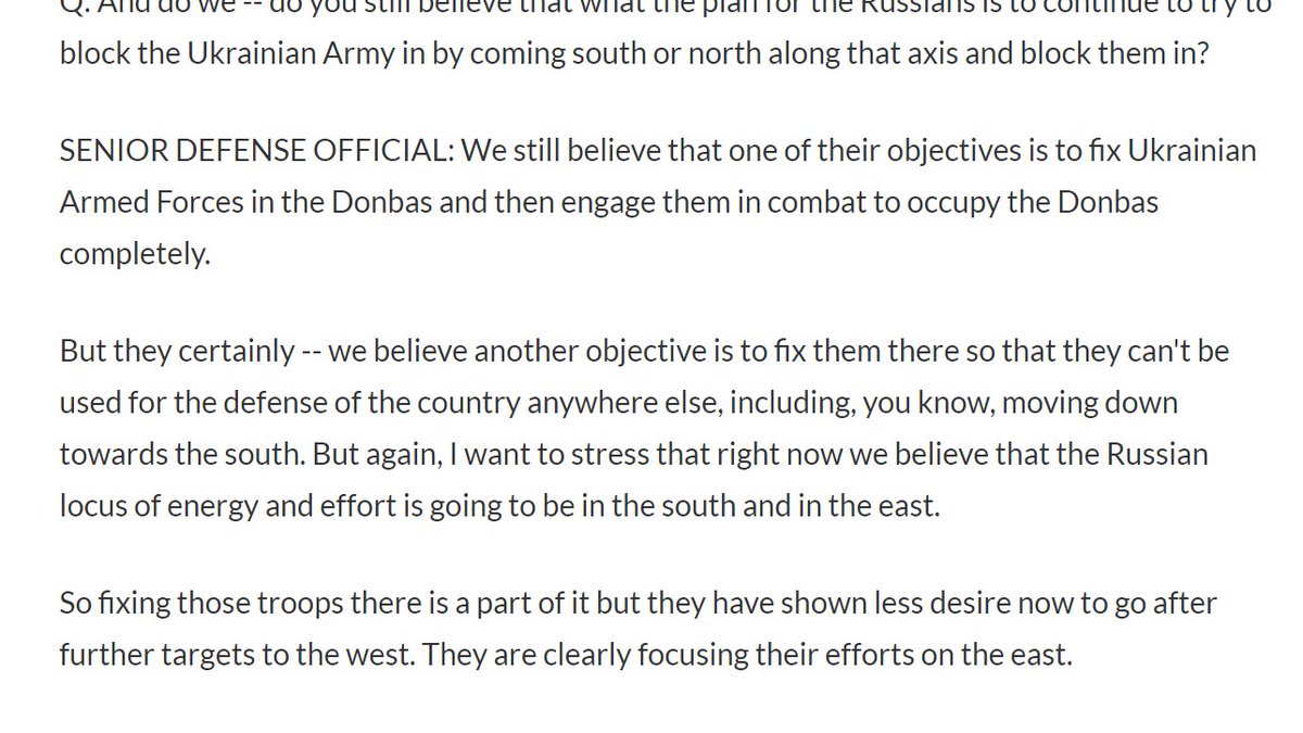 A thread on what intelligence is saying about the situation for any battle in the Donbas, by referring to the US Department of Defense unnamed briefing yesterday by a 'senior' official. defense.gov/News/Transcrip…