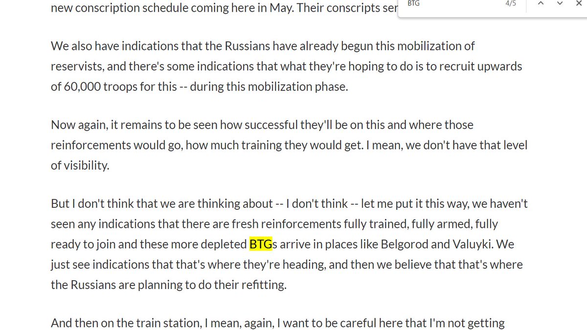 State of the Russian buildup in Donbas. Russia has sent some more BTGs into the region, somewhat fewer than 10. The estimate is that there are approx 40 Russian BTGs in the area. No est given on size of BTGs.