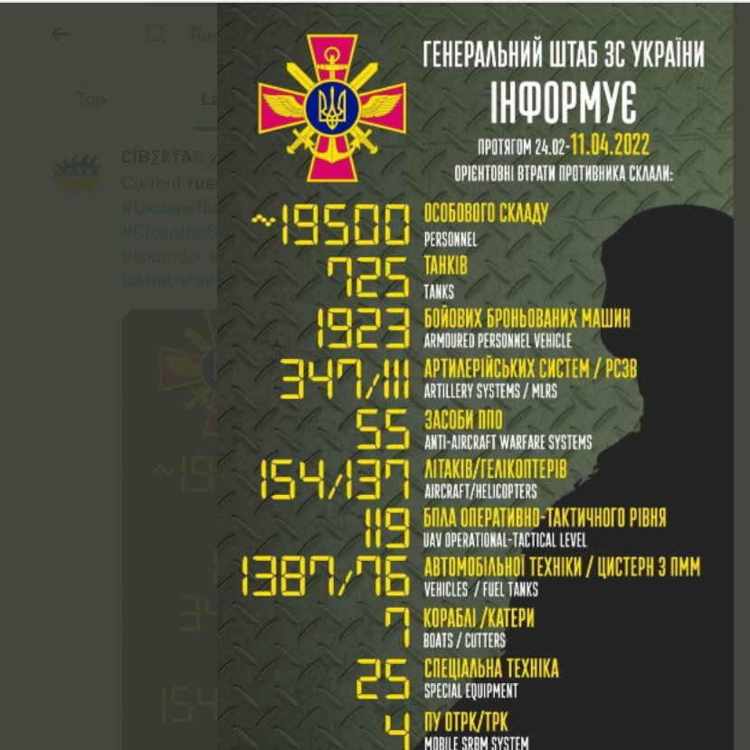 The Ukrainians are claiming that 19,500 Russian soldiers have been killed. Other sources have not estimated for a bit. However if about 30% of BTGs have been rendered inoperable, and you include losses in other services (marines, spetznaz, airborne) 19.5k is not a bad baseline