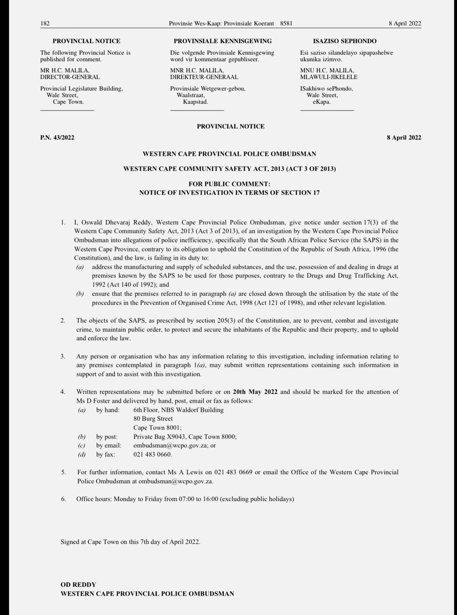 [10] Submissions can be sent via email to ombudsman@wcpo.gov.za before 20 May 2022. Ps: Whilst you & I might not be a drug user, drugs affected us all, and is “everyone’s problem” #ShutDrugHouses