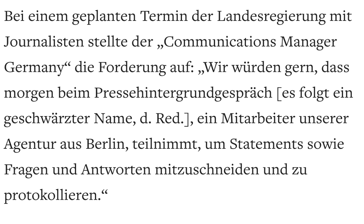 4/4 Die Gazprom-Tochterfirma verlangt, dass ein Mitarbeiter von ihr bei Hintergrundgesprächen der Landesregierung (!) mit Journalisten dabei ist, um Fragen und Antworten "mitzuschneiden". Bei Telefonaten soll er "passiv mithören."