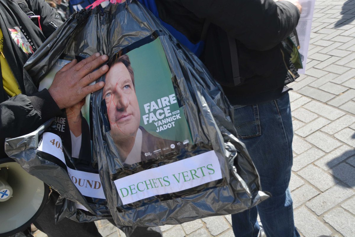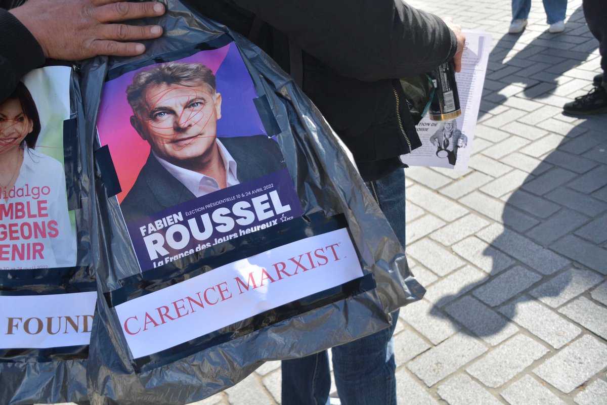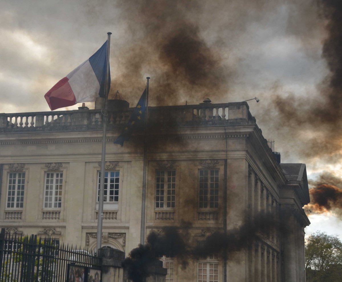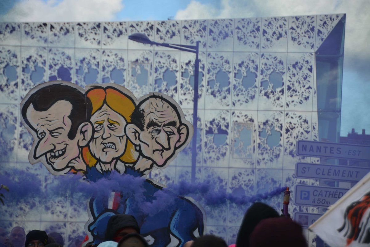 Un cerbère aux têtes de Macron, Le Pen et Zemmour. Quelques confettis. Une banderole révolutionnaire. Des bulles et des fumigènes.