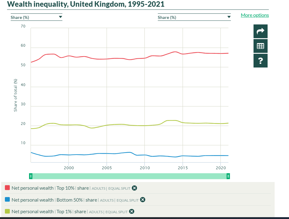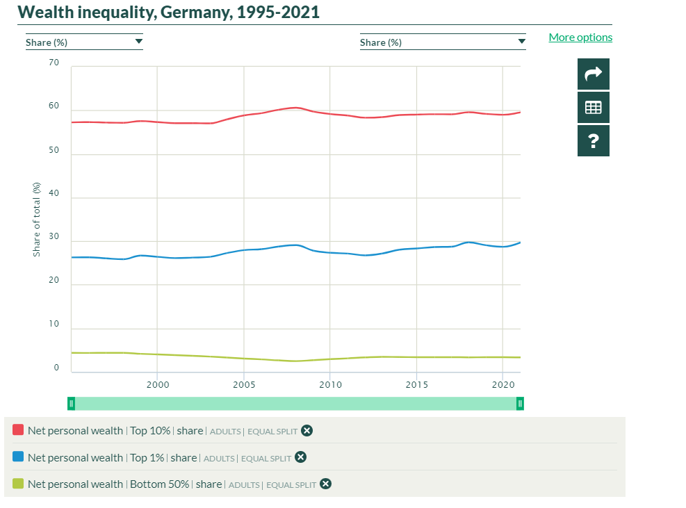 Noch heftiger sieht es bei der Vermögensverteilung aus. In allen Ländern haben die reichsten 1% der Bevölkerung einen größeren Anteil am Gesamtvermögen als die unteren 50%. Kein Mensch kann mir erzählen, dass das etwas mit "Leistung" zu tun hat.
