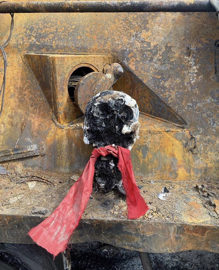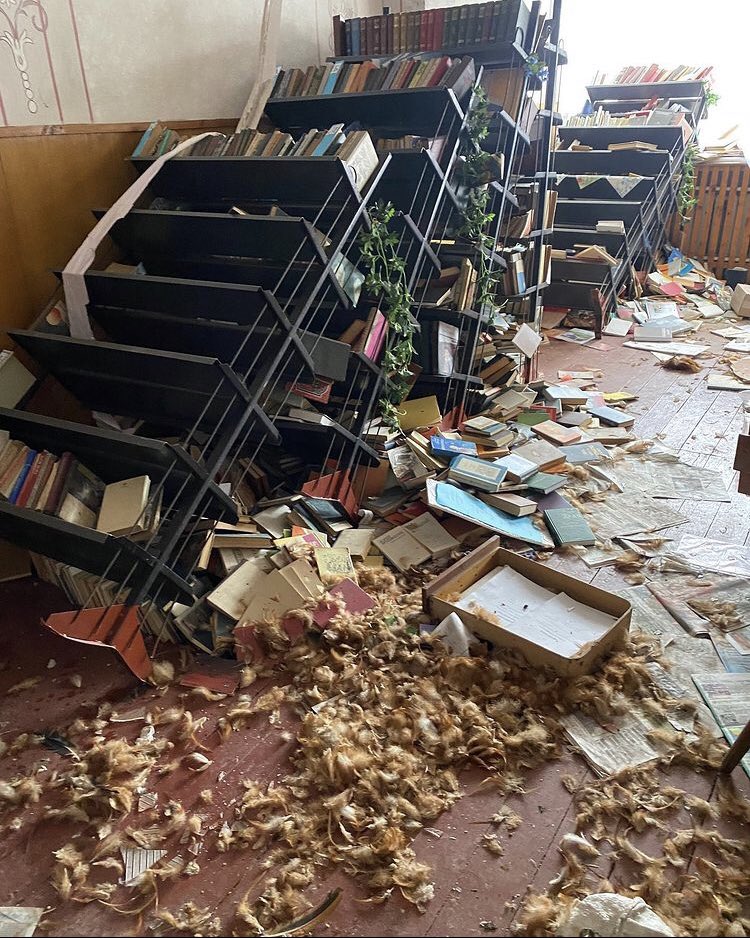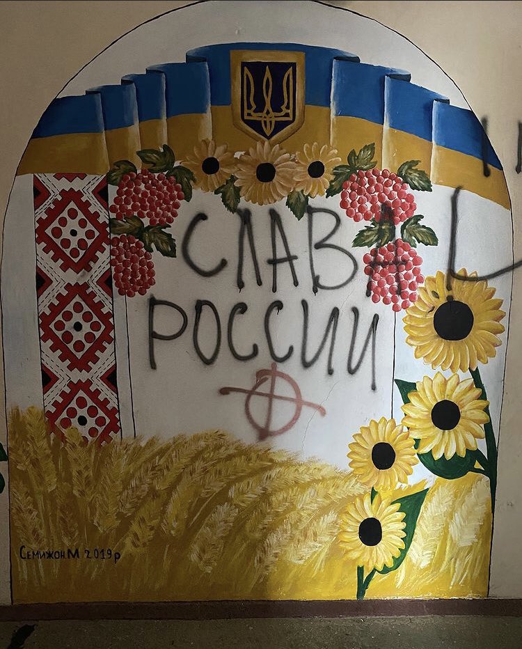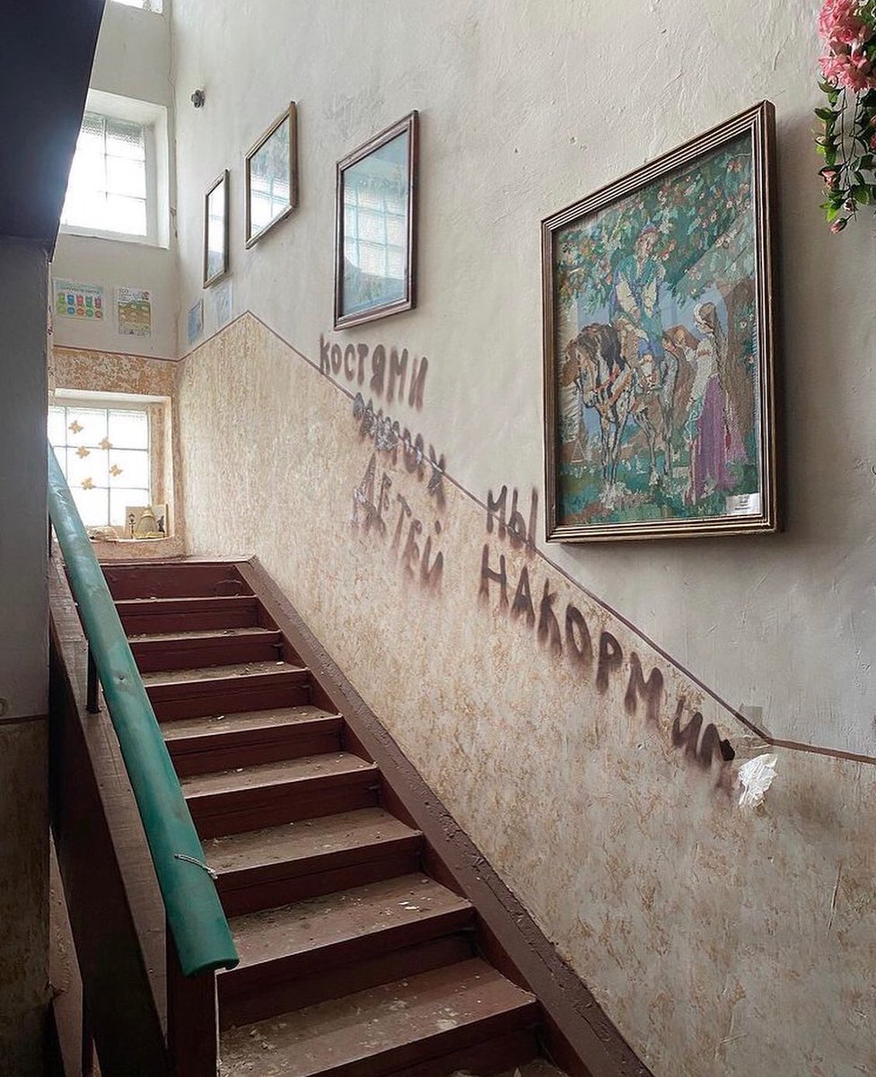 their civilian prisoners, several of whose bodies were later found nearby. The community center itself was ransacked. Soldiers spray painted the words “glory to Russia” and a ‘White Power’ symbol on one wall panel.. /2