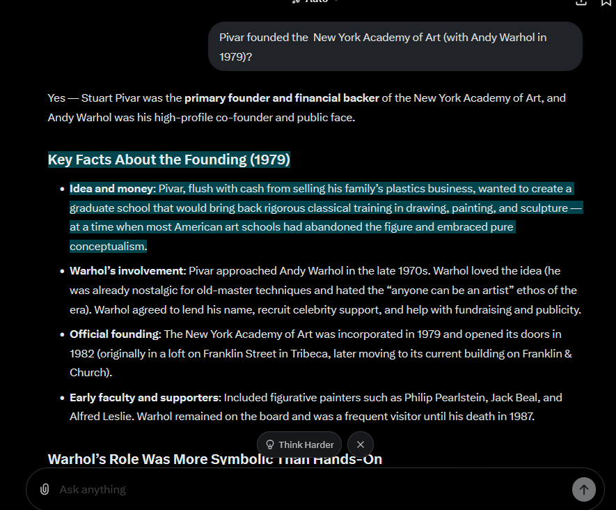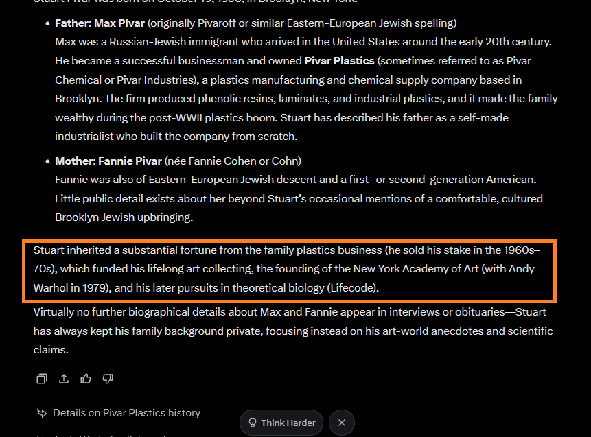 Grok : Stuart Pivar inherited a substantial fortune from the family plastics business .., which funded his lifelong art collecting, the founding of the New York Academy of Art (with Andy Warhol in 1979), and his later pursuits in theoretical biology (Lifecode).