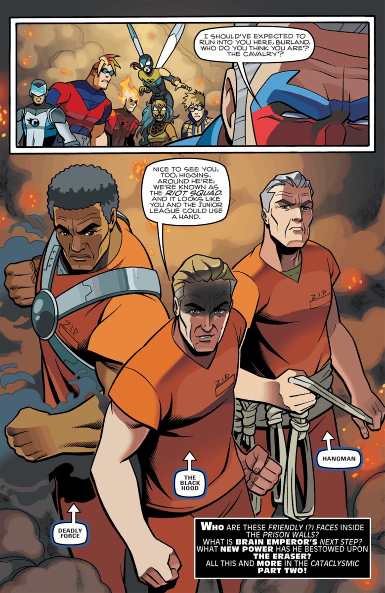 The Brain Emperor meanwhile raids a prison that holds most of the supervillain enemies of the Crusaders including the Eliminators from the bronze age, one-time Shield foe Flaky Puff (now called the Identity Thief) and... the Eraser. Not doing so hot.