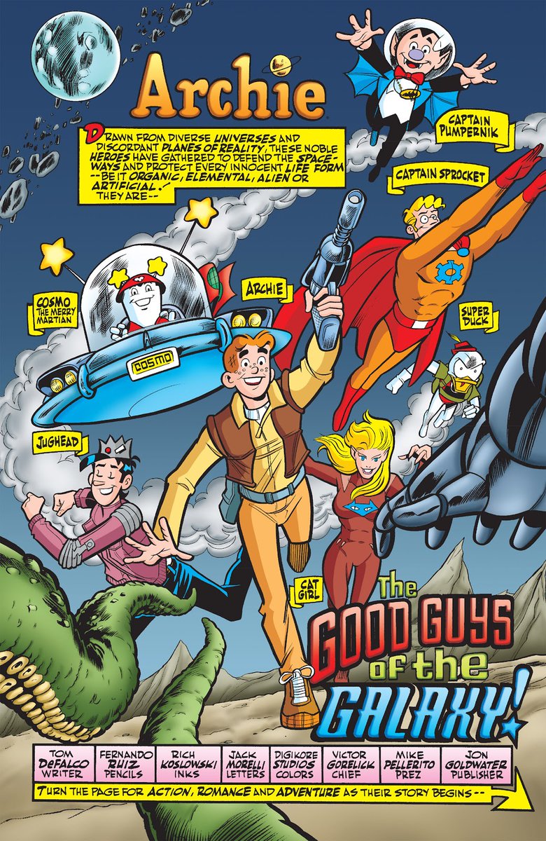 With a waning of "traditional" Archie titles there were still of course references to the Archie superheroes in various titles such as Archie #655's "Good Guys of the Galaxy" by Tom DeFalco and Fernando Ruiz. Gee I wonder what kinda movie this might be parodying huh