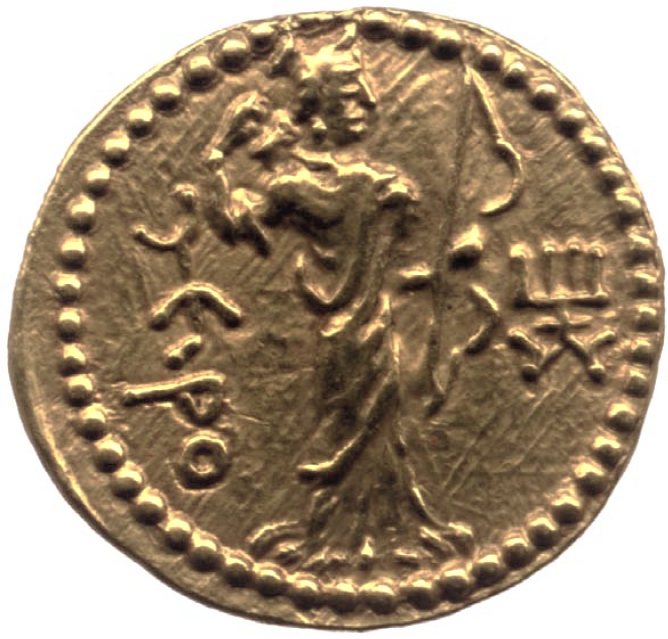 A kuShANa coin showing the Eastern Iranic deity of victory vainaiti. In Zoroastrian branch of the tradition, the deity is the male vanant associated with the star Vega (𝛼 Lyrae). This evidently goes back to the proto-I-Ir period in the least as the vedic abhijit has an identical
