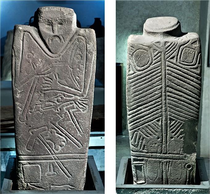sides. Above are front & back & here is the 3rd side with clear imagery on it. It depicts an ithyphallic male figure in a general iconographic convention seen in the later "balbal" stones of shaka, mongolic & turkic peoples & the more mysterious Hakkari stones. However, there is