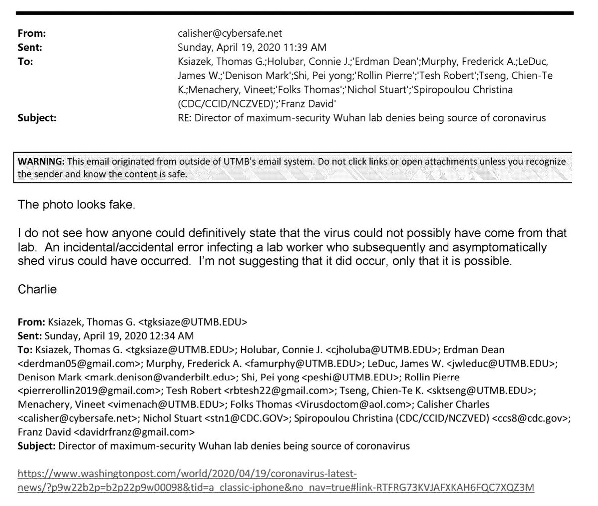 @TheLancet@emilyakopp This is where one esteemed infectious diseases expert (also recently passed away) says, in an email, that being a brilliant and charming scientist does not rule out the possibility of an accidental infection in the lab.