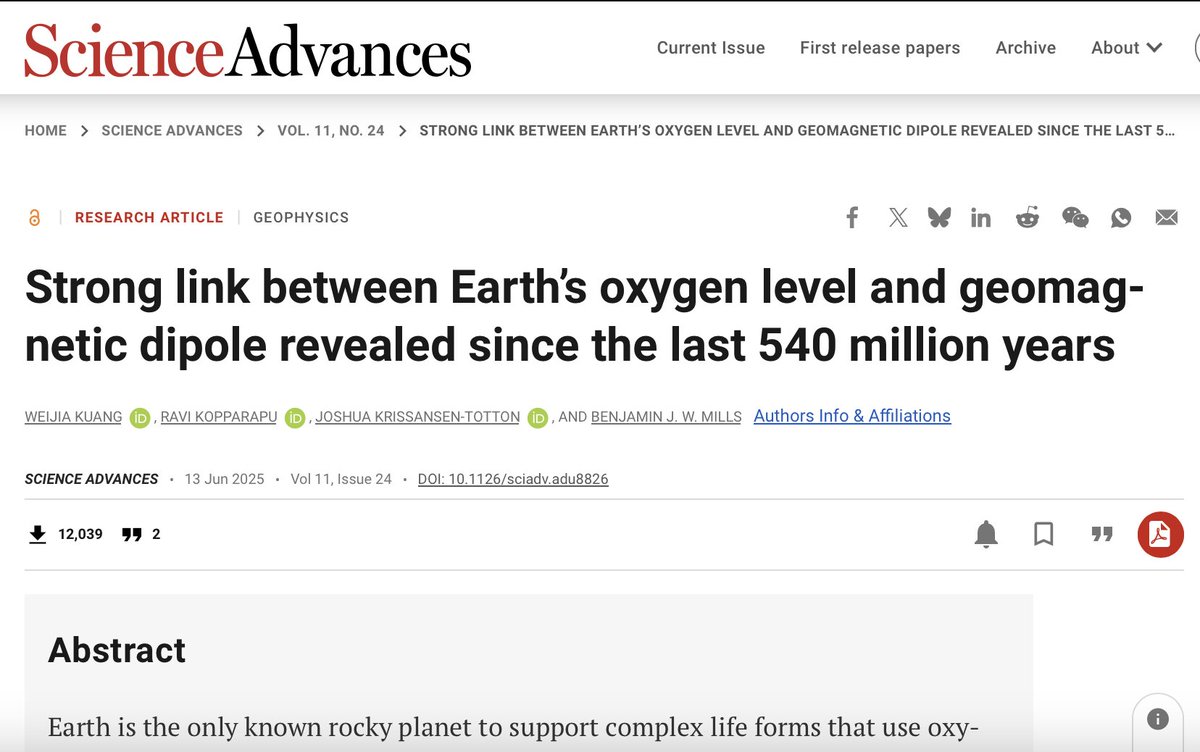 2. If the geomagnetic dipole and atmospheric oxygen have been synchronized for 540 million years, they must be coupled by a transducer that operates at the speed of the field. That is what physics teaches us........but not Eric Weinstein.