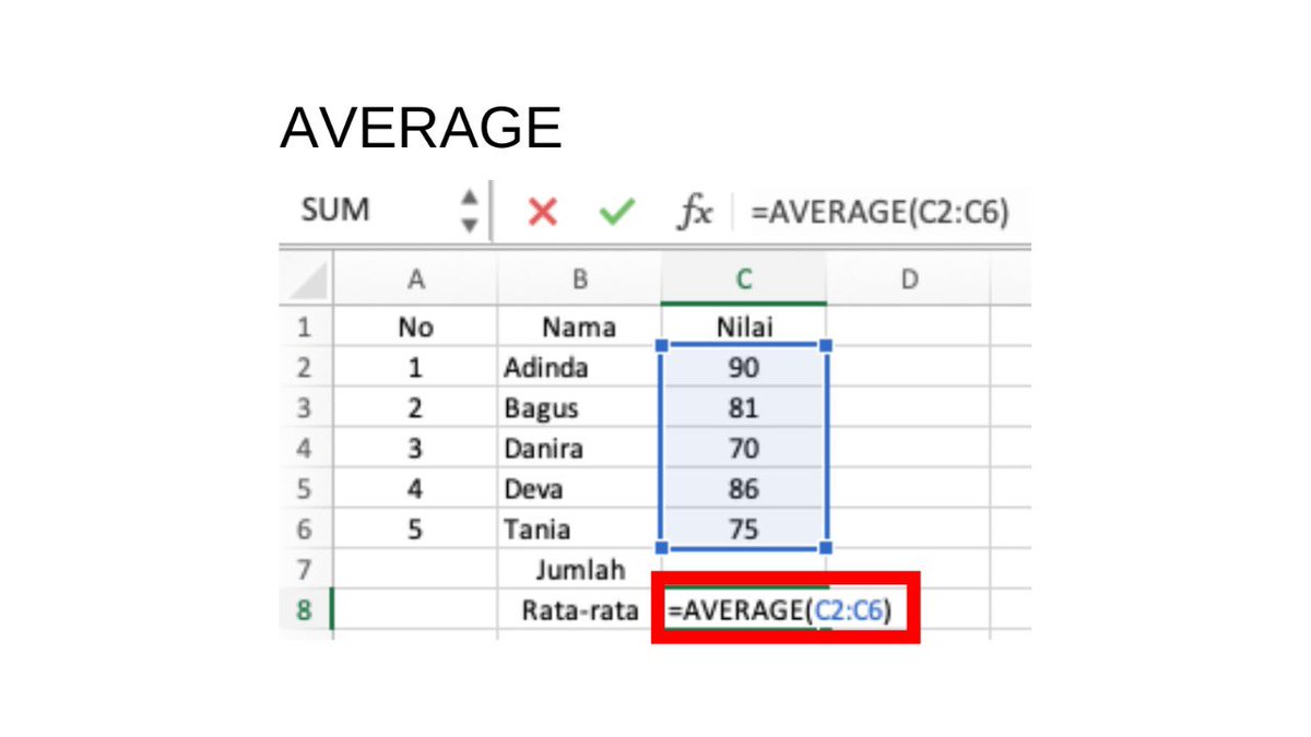 Berfungsi untuk mencari nilai rata-rata dari sebuah data, biasanya fungsi ini digunakan untuk mengetahui nilai rata-rata dari jumlah keseluruhan bisa baris ataupun kolom yang dibutuhkan.