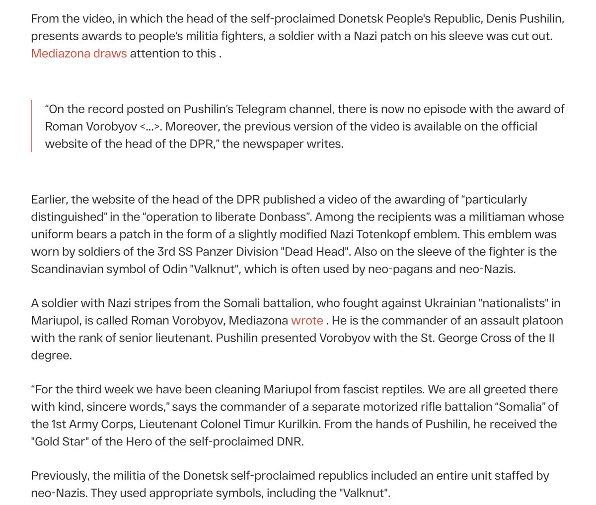 DNR head Pushilin awarded medals to a group of militants "liberating" Mariupol of "Nazis." One award went to Roman Vorobyov, who was wearing a neo-Nazi Odin patch on his arm. Video of the ceremony was posted on telegram, but was later cut to remove the part w/ Vorobyov. Oops.🤷🏻♀️