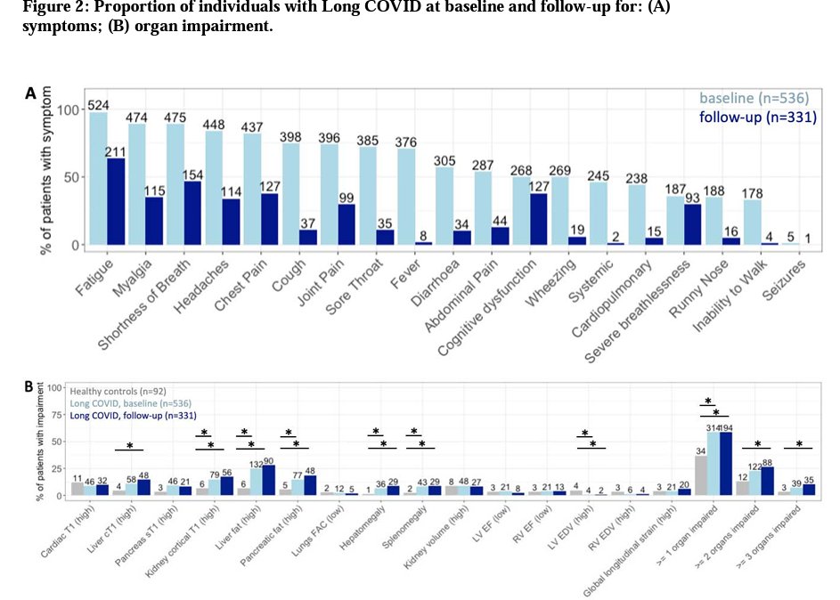 COVID longa: estudo🇬🇧 com 536 pessoas revela a presença de sintomas pós-COVID em 6 meses, com comprometimentos de um único órgão (59%) e de múltiplos órgãos (23%). Após 1 ano da infecção, esses sintomas persistiram em 59% e 27% dos indivíduos.
