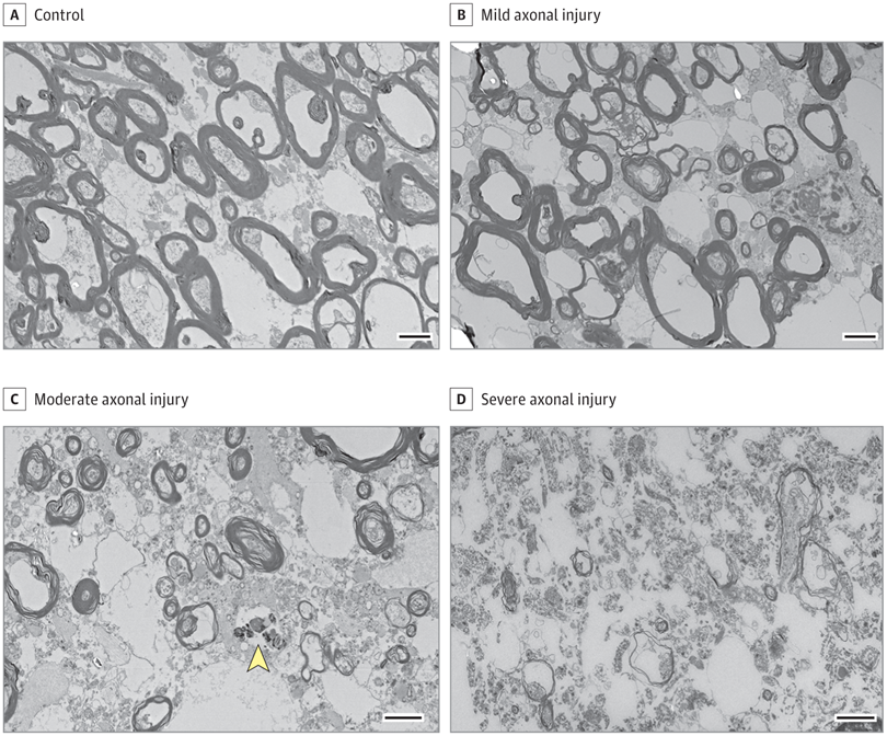 Nas imagens acima, a gente consegue ver áreas bem escuras meio circulares/elipticas, que mostra essa cobertura de mielina nos axônios (em A). Quando a gente vai olhando as figs. B, C e D, a gente vai vendoessa perda dessa cobertura, se intensificando de B para D.