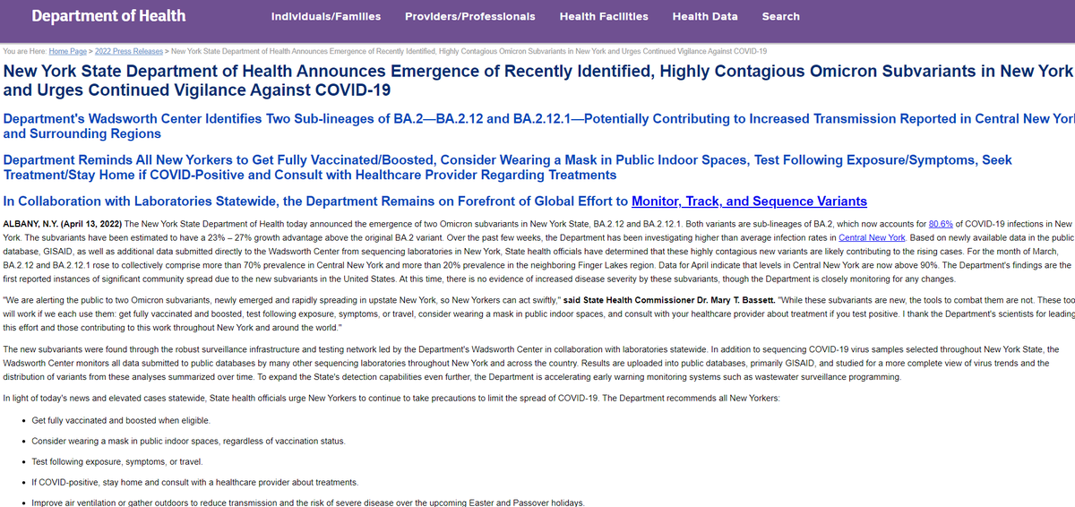 O Dpto de Saúde de NY🇺🇸 alerta para a circulação da BA.2.12 e BA.2.12.1, sub-linhagens da BA.2 (ainda é Omicron), que corresponde a 80,6% das infecções em NY.