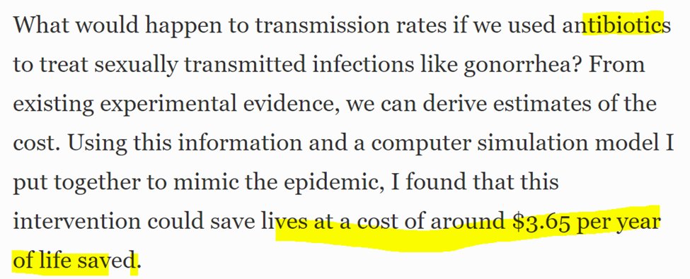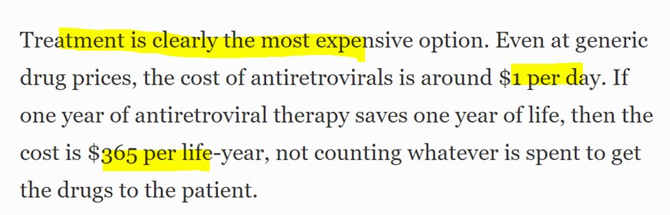 On the other hand, preventing infections by using antibiotics to heal the sores through which HIV infects, costs only $3.65/per life-year.
