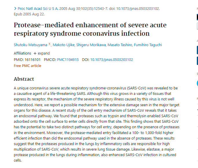 4/ Mainly the Japanese who researched the association between neutrophil elastase and Sars Coronavirus #1. There were conclusions that not only did elastase damage lung tissue but also seemed as though the virus used it to gain access to other receptors. pubmed.ncbi.nlm.nih.gov/16116101/