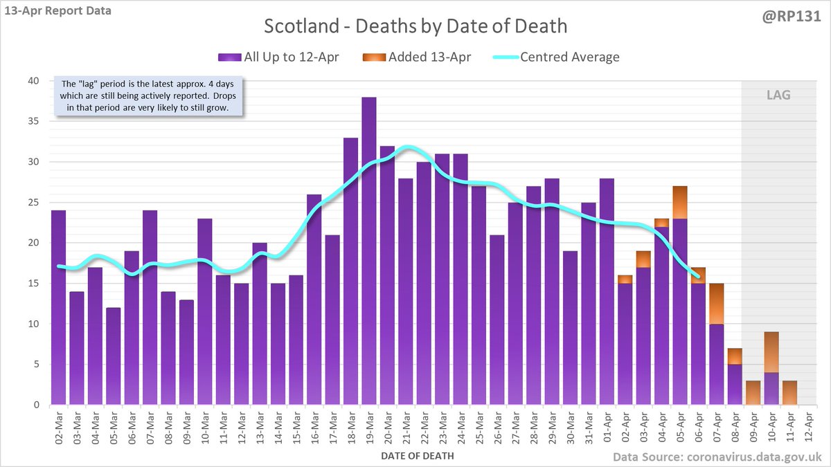Separate charts for England (615) Scotland (28) Wales (5) and Northern Ireland (3). Note the different scales. Also on certain days the date-of-death data for Scotland/Wales/NI doesn't get updated so the orange bars may be mising or include multiple day's numbers.