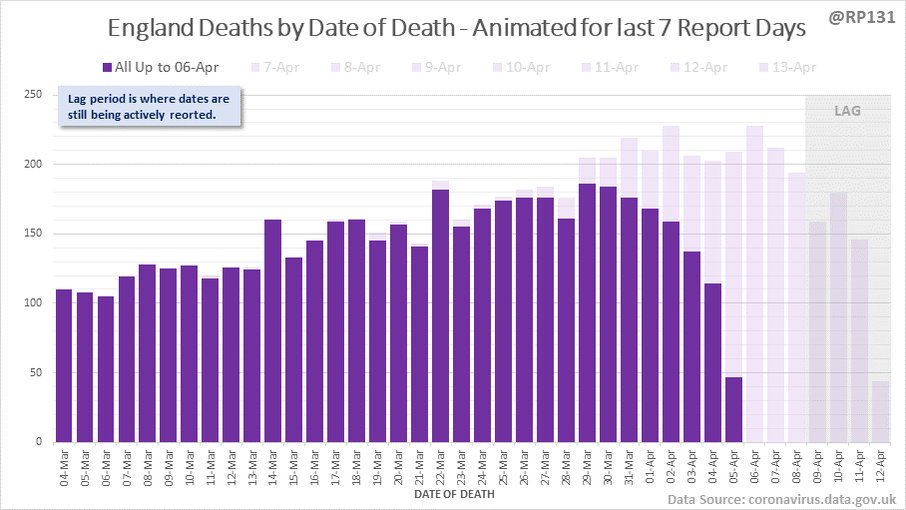 Animated chart to show how the #covid19uk deaths by date of death have been contributed to by reports over the last 7 days. Note this just includes England numbers as other nations don't always publish their date-of-death data every day.