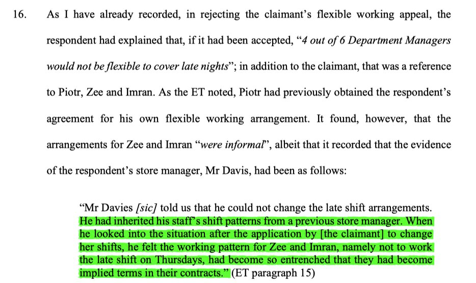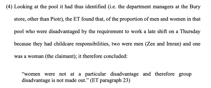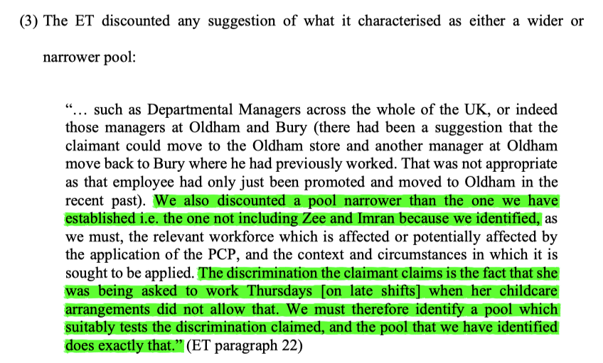 3/ In constructing a pool for comparison for the s.19 claim, the ET pooled together department managers & trainee managers, as they potentially had to work late Thursday shifts. It was noted that 2 of the male dept managers had childcare issues on a Thursday night.