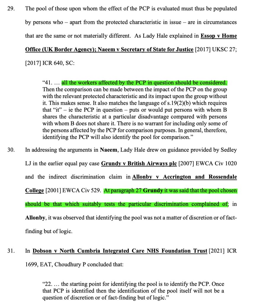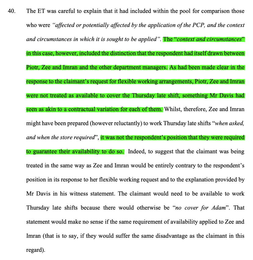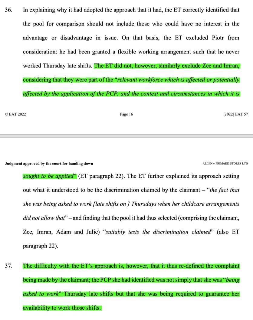 7/ The EAT found that here the ET hadn't identified a pool consistent with A's case, which concerned a PCP of being required to guarantee availability to work Thursday late shifts. Had they done so, the ET would have excluded those not required to give that guarantee.