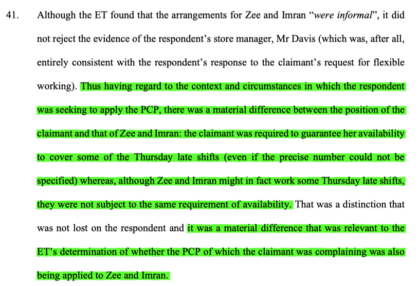4/ However, the evidence before the ET was that those 2 male dept managers had an entrenched working pattern not to work late shifts on Thursdays - accordingly they had not been required to guarantee Thursday late shift working - the PCP didn't apply to them.