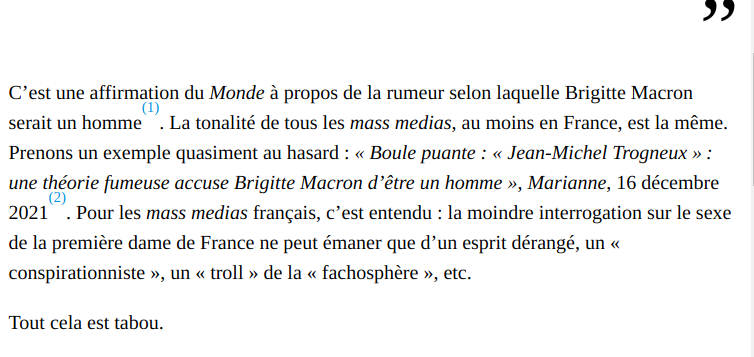 Un article qui reprend la rumeur selon laquelle Brigitte Macron serait un homme, en prétendant dénoncer "la censure" et le "tabou" sur le sujet.