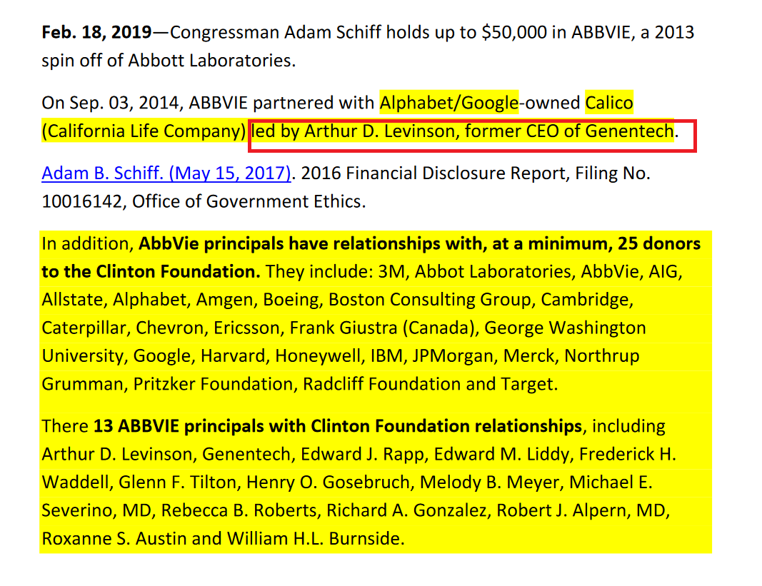 "Analysis of Adam Schiff’s Clinton Foundation conflicts in up to $50,000 in Abbot Labs spinoff ABBVIE" tinyurl.com/y2u6rce6