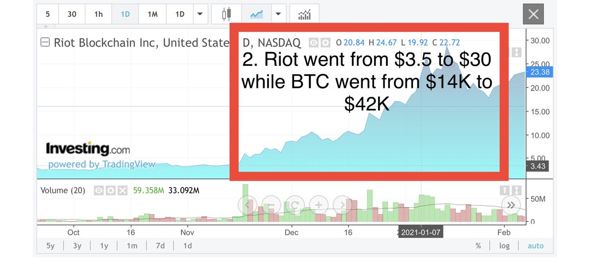 1. Riot dropped from $4 to $2.5 while BTC went from $11K to $22K during the same period Aug-Oct 2020. Everyone were saying WTF and many people sold. Turns out this was the first accumulation phase by hedge funds.