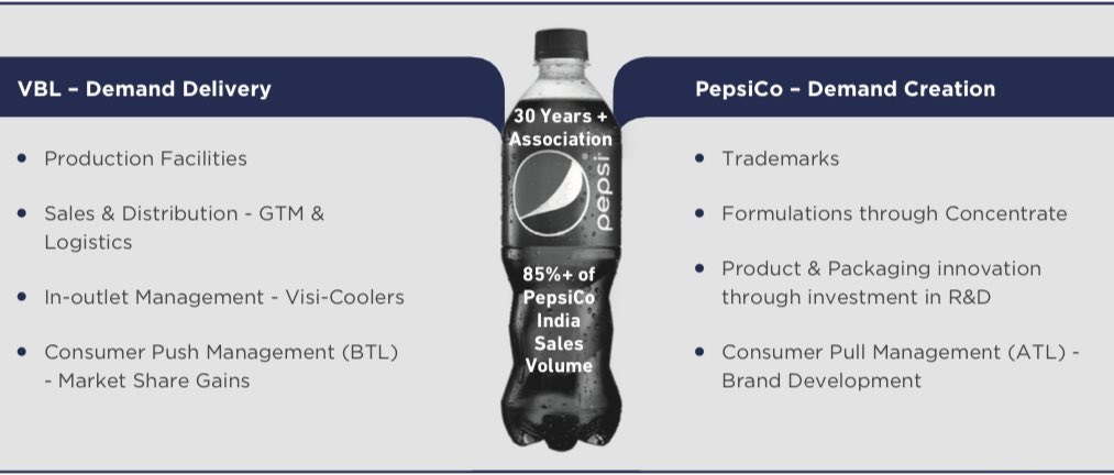 PepsiCo offers brands, concentrates & marketing support to VBL. In turn, VBL takes complete control over the manufacturing & supply chain processes, managing capital allocation strategies & pricing decisions.