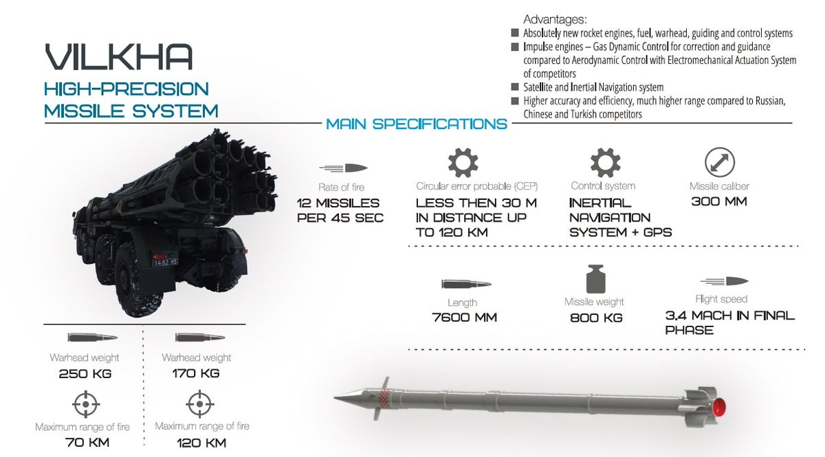 The UA service name for the Vilkha is "Alder", which has a range of up to 70 km equivalent to the non-modernized MLRS "Tornado".