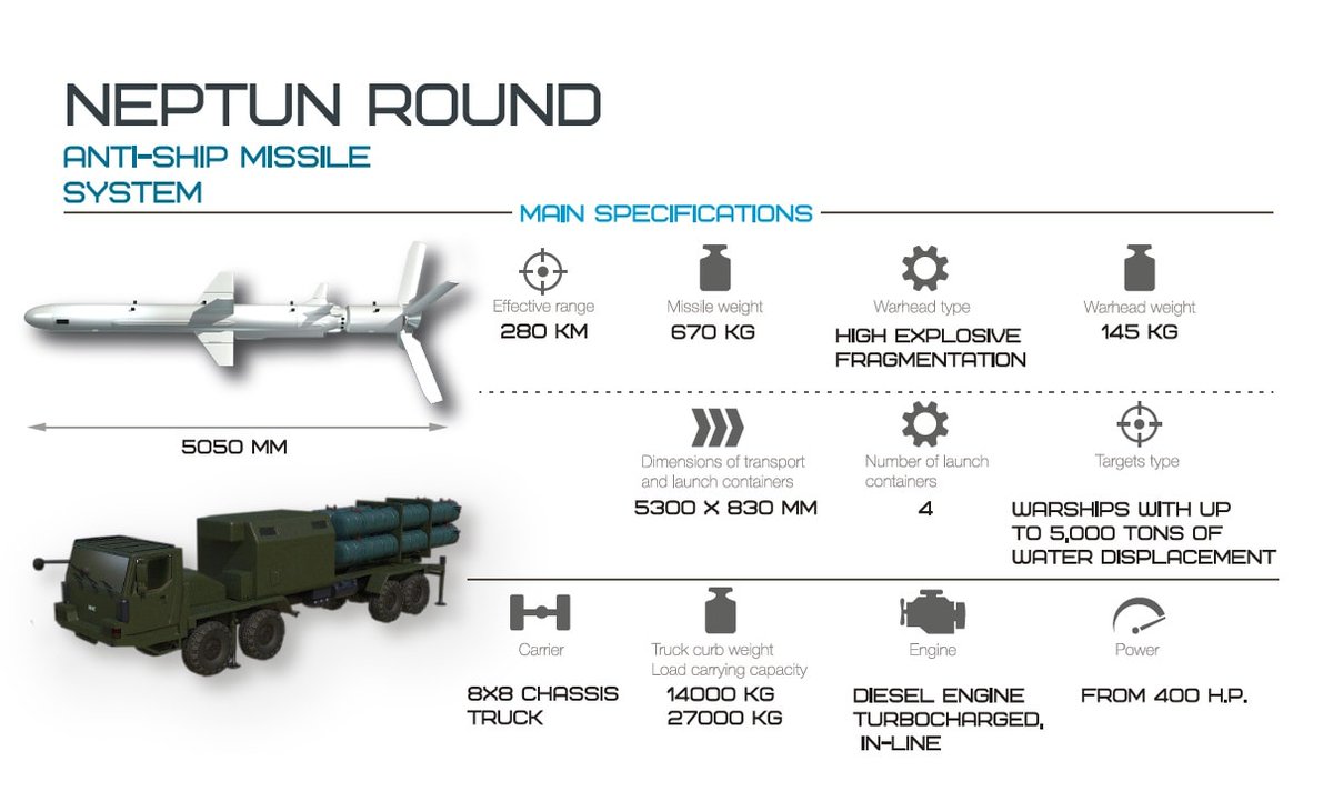 The Neptune R-360 missile has a mass of 870 kg [1,918 lb], the weight of the warhead is 150 kg [331 lb]; missile diameter - 380 mm [15 in]; maximum launch range - 280 km [151 nmi].