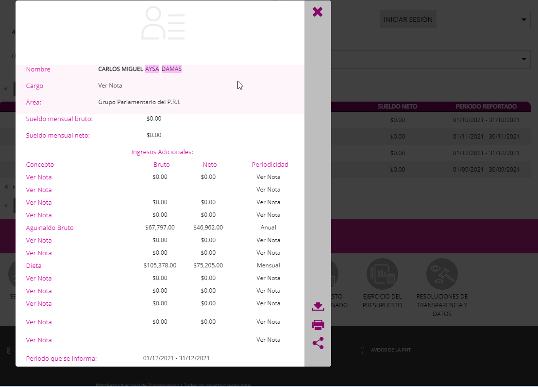 🔹Carlos Miguel Aysa Damas, diputado del Grupo Parlamentario del PRI, percibe una dieta bruta mensual de $105,378.00 y un aguinaldo de $67,797.00