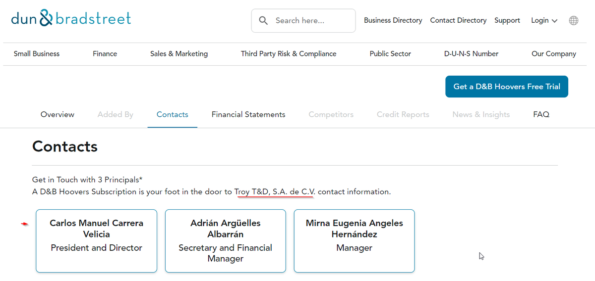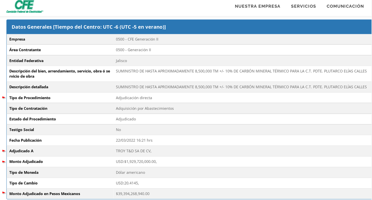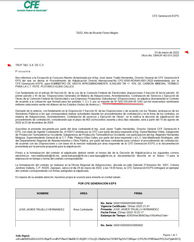 🔹CFE que dirige Bartlett, da contrato por $39,394,268,940.00 vía directa a Troy T&D, cuyo Pdte. y Dir. es Carlos Manuel Carrera Velicia, cercano a Rafael Moreno Valle Suarez, padre del exgobernador de Puebla, Rafael Moreno Valle Rosas, y de Juan Luis Elek Klein.