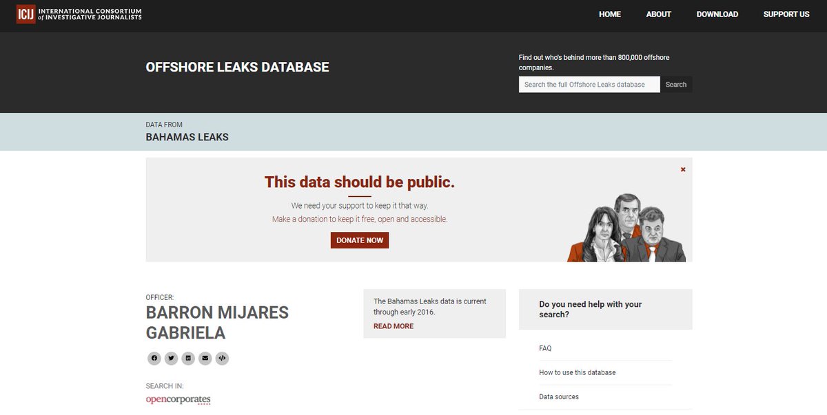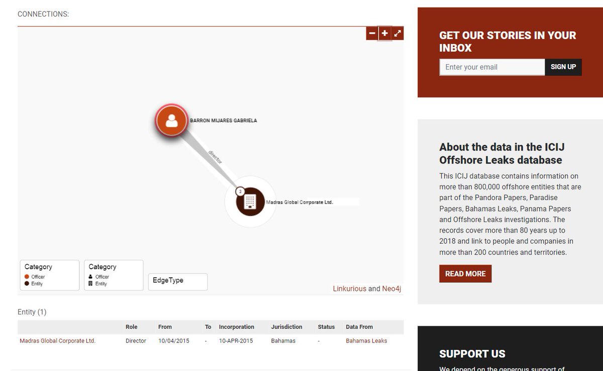 Gabriela Barrón Mijares, madre de Gabriela Cuevas Barrón, Pdta. de la Unión Interparlamentaria e integrante del Partido Morena, aparece vinculada a la compañía offshore Madras Global Corporate Ltd., teniendo como paraíso fiscal Las Bahamas, de acuerdo a la base de datos del ICIJ.