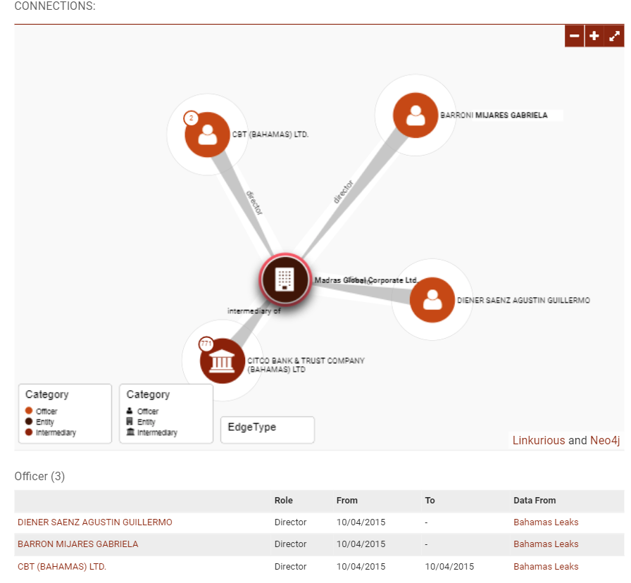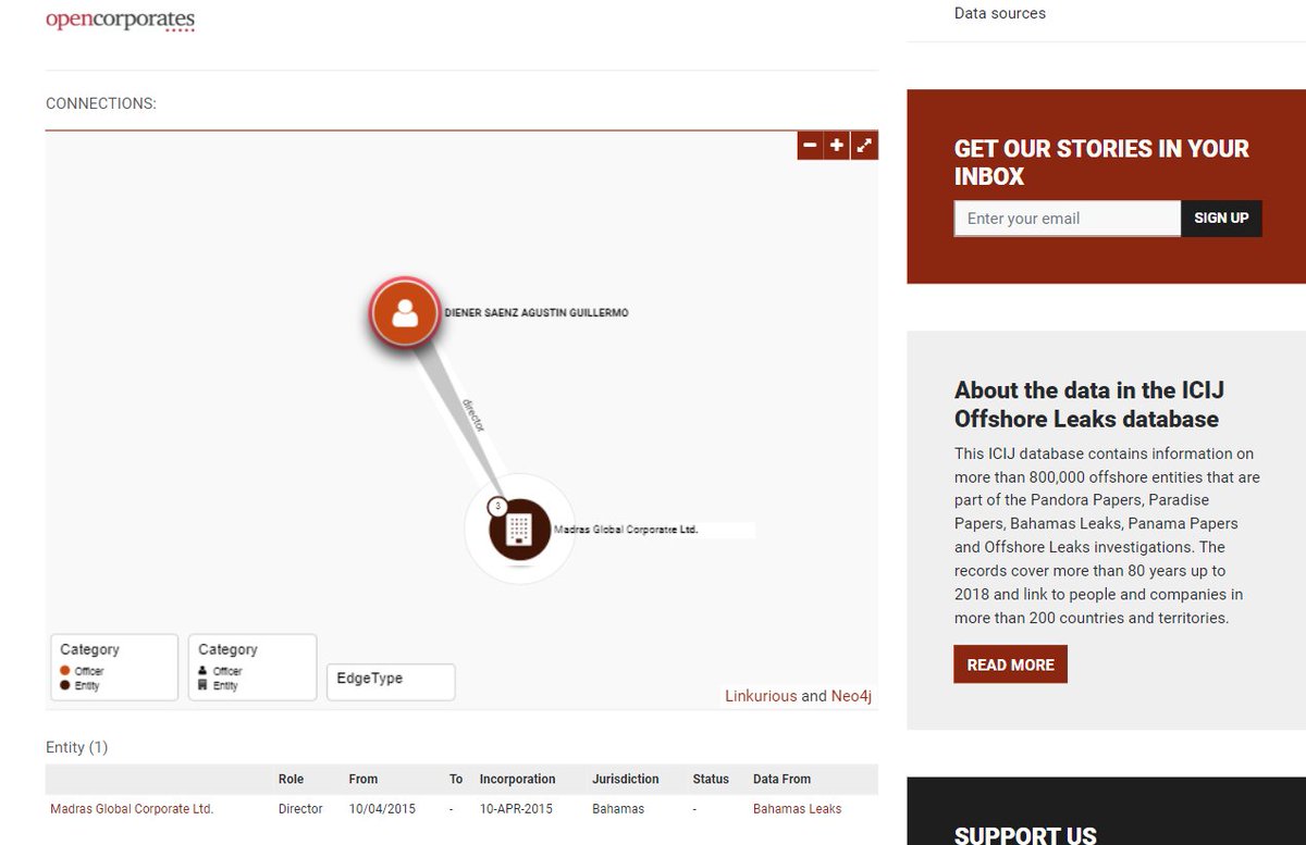 🔹Diener Sainz Agustín Guillermo, ex pareja de Gabriela Barrón Mijares, aparece vinculado a la compañía offshore Madras Global Corporate Ltd., teniendo como paraíso fiscal Las Bahamas, de acuerdo a la base de datos del ICIJ.
