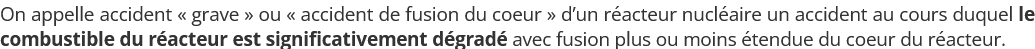 3/ Tout d’abord, voici une définition de l’Institut de radioprotection et de sûreté nucléaire (IRSN) sur l’accident de fusion du cœur pour les réacteurs à eau pressurisée (REP, 56 en exploitation en France). En France, il n’y a jamais eu de fusion de combustible sur un REP.