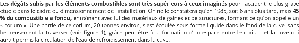 5/ Pour exemple, sur le réacteur à eau pressurisée (REP) n°2 de TMI en 1979, 45% du cœur a fondu, engendrant la formation de 20 tonnes de corium (mélange uranium et matériaux de gaines et de structures). En France, nous n’avons jamais connu d’accident d’une telle ampleur mais…
