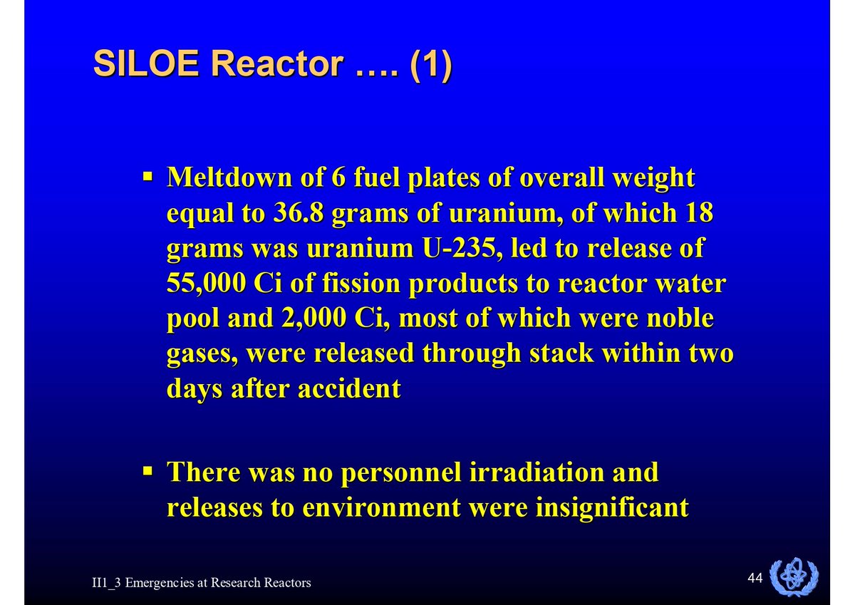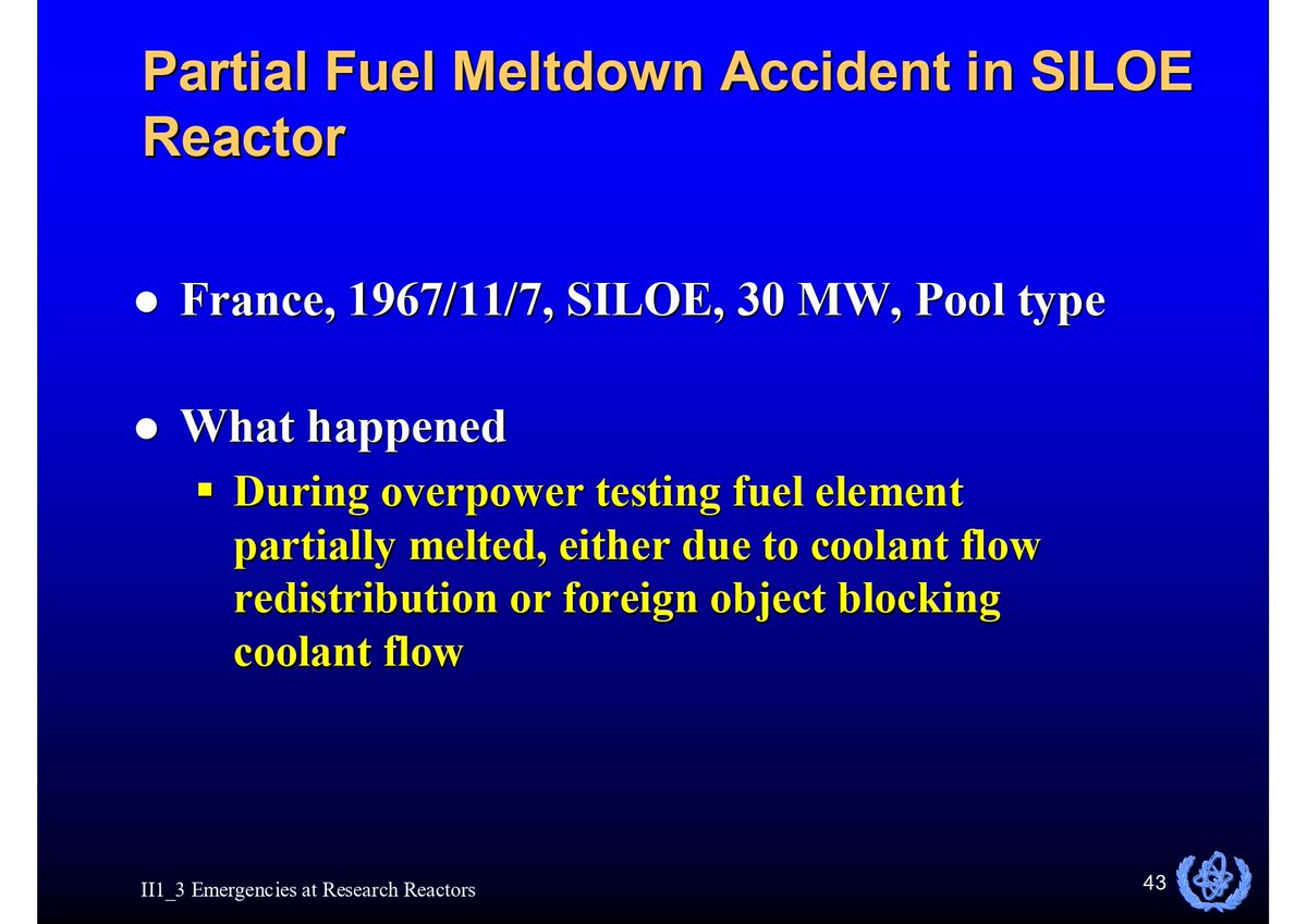 13/ A ce stade, et en attendant des recherches complémentaires (en cours), on va compter une seule fusion pour les réacteurs EL de Saclay. Enfin, la 5éme fusion de combustible s’est déroulée à Grenoble en 1967 sur le réacteur de recherche Siloé.