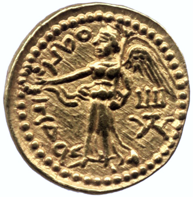 A kuShANa coin showing the Eastern Iranic deity of victory vainaiti. In Zoroastrian branch of the tradition, the deity is the male vanant associated with the star Vega (𝛼 Lyrae). This evidently goes back to the proto-I-Ir period in the least as the vedic abhijit has an identical