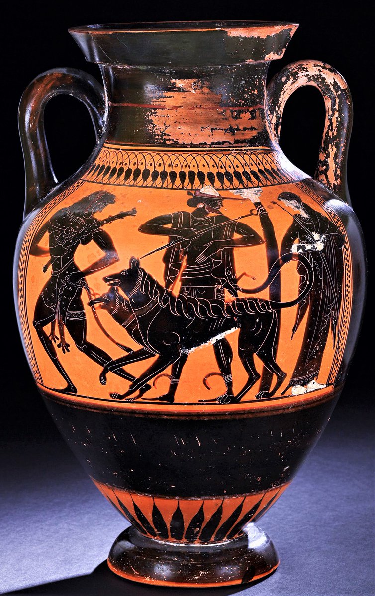 A brief discussion of some old IE motifs: Here is Herakles (left) seizing the dog of the netherworld Kerberos (note 2 headed here). Behind the dog is the god Hermes with his caduceus. To the right is the awful Persephone, the goddess of the realm of the dead. While Hermes is a