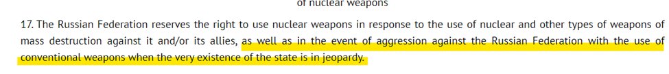 1.Pkt. 17 doktryny deklaratywnej z czerwca 2020 wspomniana, że Rosja może odpowiedzieć na użycie przez przeciwnika broni konwencjonalnej przy użyciu broni nuklearnej.