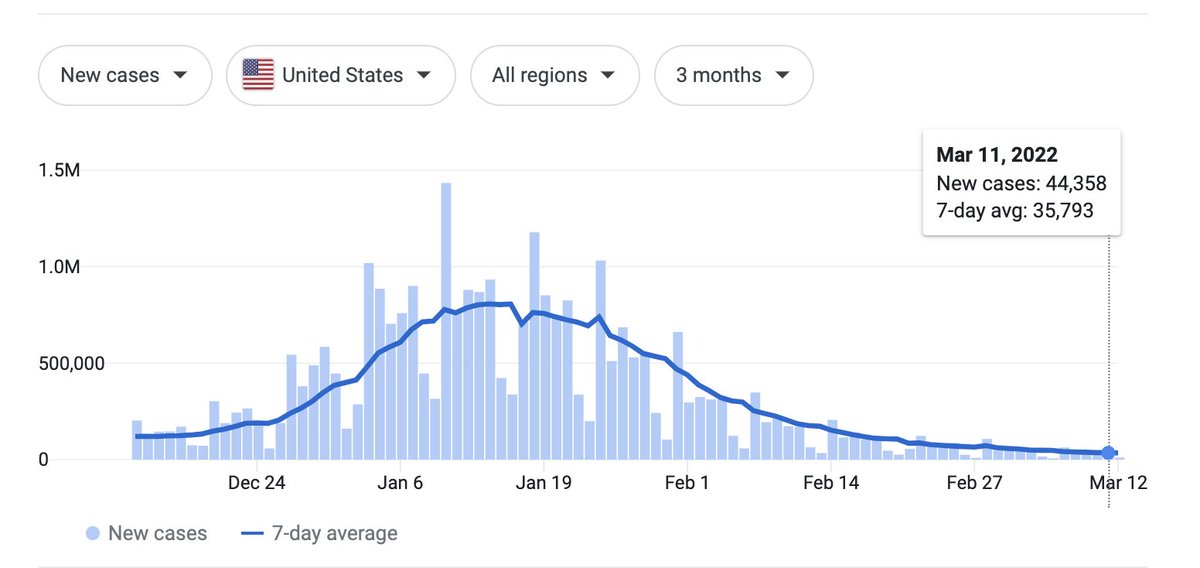 No question that the U.S. is looking good, Covid-wise. (Of course, Ukraine could hardly be more heartbreaking.) Case-rates are⬇95% since Jan., hospitalizations⬇80%, & deaths⬇50%. While case #’s are undercounts due to home testing, the trend is unmistakable & reassuring. (2/25)