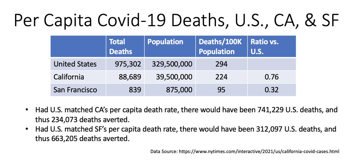 If we surge again, we'll need to choose response. I'd argue a response like CA's or SF's would be best. Had US matched CA's death rate, 234K deaths would have been averted to date; if matched SF's, 663K averted (1/4).