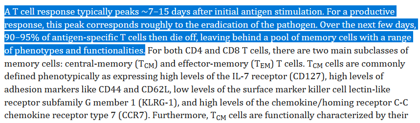 Pour les lymphocytes T, entre la détection de l'antigène, l'activation lymphocytaire, la prolifération (expansion clonale), et la différenciation (cellules effectrices/cellules mémoires), il faut compter 7 à 15 jours ncbi.nlm.nih.gov/pmc/articles/P…